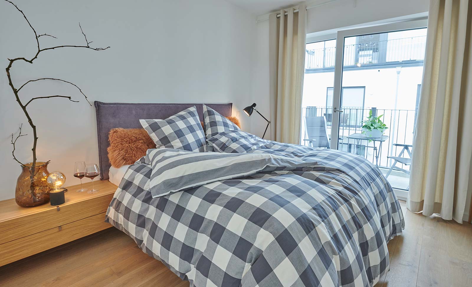 Der schöne Schlafraum mit einem bequemen Boxspringbett ist zum ruhigen Innenhof gelegen und verspricht erholsame Nächte. Auf dem Balkon können Sie entspannte Stunden genießen.
